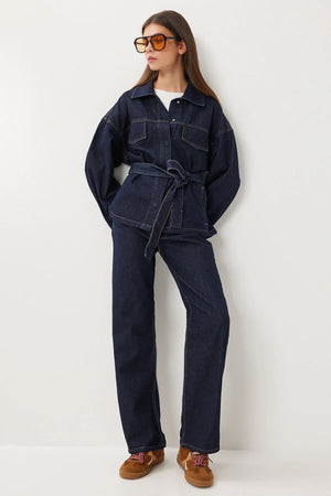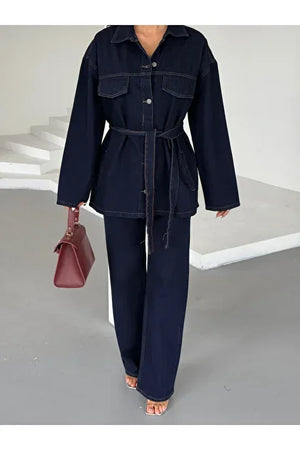 طقم جينز نسائي عصري قطعتين – جاكيت بحزام وبنطلون بقصّة مريحة