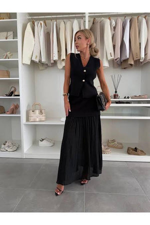 فستان باللون الأسود الكلاسيك بتصميم بسيط وناعم، يتميز بقصة طويلة وانسيابية تمنح إطلالة راقية وأنثوية. مناسب للاستخدام اليومي والمناسبات، سهل التنسيق مع مختلف الإكسسوارات والأحذية ليعطيك مظهرًا أنيقًا في كل الأوقات.