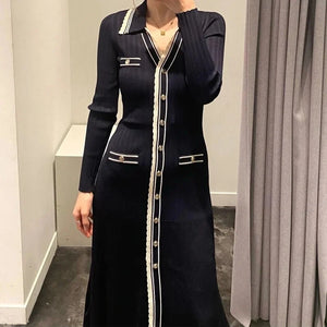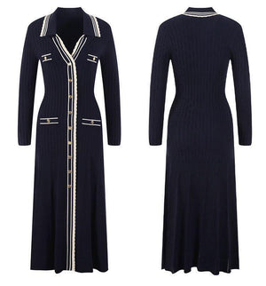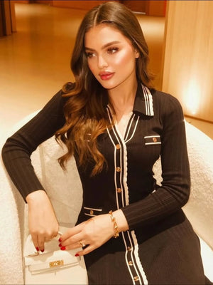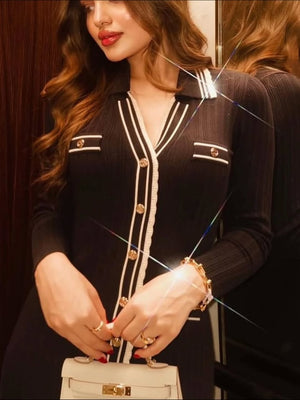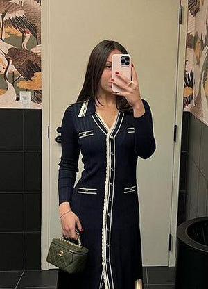 فستان ساندرو الشهير باللون النيلي، تصميم أنيق مستوحى من الطابع الفرنسي الكلاسيك. يتميز بقصة ميدي راقية، أزرار أمامية متناسقة، وتفاصيل بارزة باللون الأبيض تضيف لمسة فاخرة ومميزة. مناسب للإطلالات اليومية الأنيقة أو المناسبات البسيطة، ويمكن تنسيقه بسهولة مع الكعب أو البوت لإطلالة عصرية متكاملة